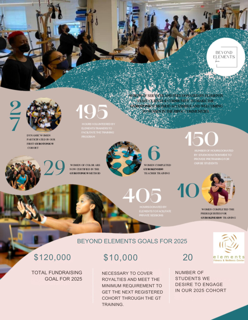 Your gift will provide sustaining support for Beyond Elements’ initiatives, training, and certification process for BIPOC women. We are confident that with your partnership we will be able to meet our 2026 goal and strengthen our commitment to diversifying the face of the GYROTONIC® Method. Please keep in mind that each student has a minimum expense of $960, which goes directly toward royalties required to complete the program.